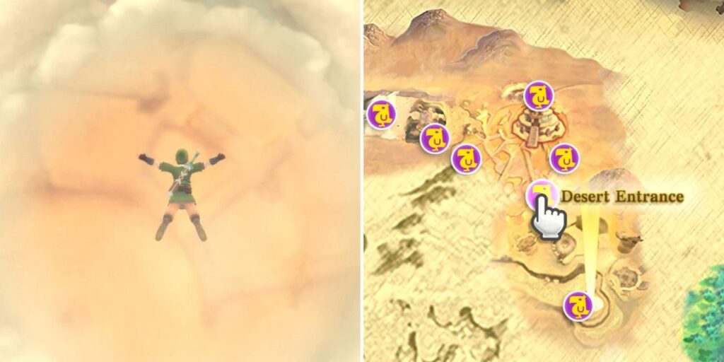 Es posible que los jugadores aventureros ya se hayan topado con la rueda de la fiesta en su primera visita al desierto de Lanayru, pero independientemente de ello, es bastante fácil de encontrar. Los jugadores deben dirigirse al pilar de luz dorado y elegir la estatua del pájaro de la entrada del desierto cuando se les pregunte adónde les gustaría ir. Si no activan la estatua de la entrada al desierto, tendrán que volver a pasar por las minas o dirigirse al sur hacia la entrada de la mina desde la mazmorra de las instalaciones mineras de Lanayru.