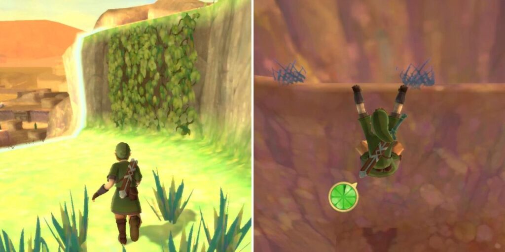 Una vez que hayan llegado a su destino, los jugadores tendrán que golpear la piedra Timeshift cercana, que inicialmente está oculta por una roca bombardeable. Al golpear la piedra, aparecerán unas enredaderas en una de las paredes circundantes a la derecha y Link podrá trepar por ellas para llegar a una nueva zona accesible. Aquí, los jugadores tendrán que colgarse de un saliente y abrirse paso hacia la izquierda para llegar al otro lado.