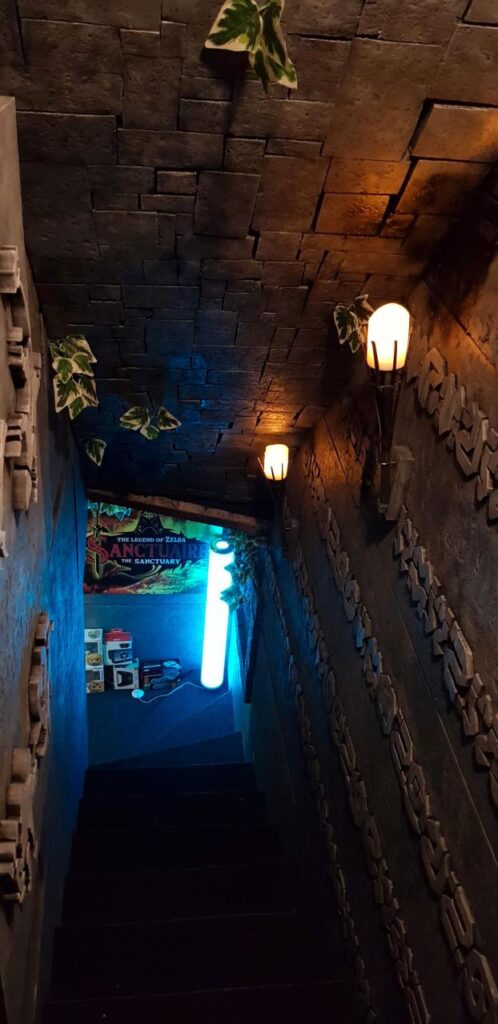 El usuario de Reddit _edlothian_ ha subido recientemente su increíble sala de juegos al subreddit de The Legend of Zelda, y está dejando a la gente boquiabierta. Tomando prestada su terminología, no se trata de una simple sala de juegos, sino de un «Santuario de Zelda,» que transporta a los que descienden por las renovadas escaleras del sótano directamente a Hyrule. Las paredes del pasillo están compuestas por una piedra gris de aspecto antiguo adornada con un texto hyliano que recorre todo el pasillo y follaje disperso, todo ello iluminado por la luz de las antorchas. De entre los iconos de la serie’, las mazmorras de The Legend of Zelda’ están entre las mejores, ya que Edlothian clava totalmente su estética incluso antes de entrar en la sala principal. Haz clic aquí para ver el resto de las imágenes.