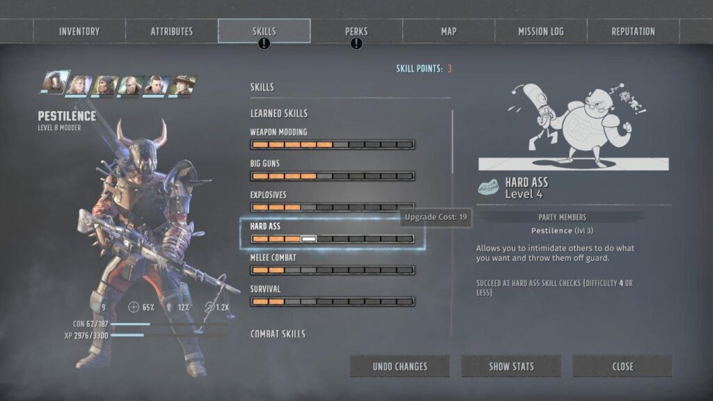 Los jugadores tienen la opción de elegir entre un par de Rangers prediseñados al principio, o diseñar el suyo propio con una variedad de peculiaridades, habilidades, atributos y perks que atraen inmediatamente al jugador. Estos sistemas no son nada nuevo para los juegos de rol, pero con peculiaridades como Bop Bag, Mime y Serial Killer, y habilidades como Toaster Repair, Weird Science y Nerd Stuff, es difícil no perderse en las posibilidades. Esto se traduce también en la jugabilidad de Wasteland 3 ‘s, donde los jugadores pueden utilizar habilidades basadas en el carisma para decir básicamente lo que quieran, o la fuerza bruta para extorsionar o matar a los personajes más inocentes.