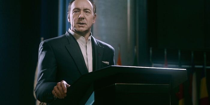 En lo que respecta a la campaña, se trata de un juego estándar de Call of Duty , reforzado por unos efectos visuales excelentes, una narrativa competente y un gran trabajo de captura de movimientos. La progresión lineal, las secuencias «on rails», los eventos rápidos y el indicador «Follow» del pasado de Call of Duty’ están aquí, por desgracia, pero incluso la campaña es lo suficientemente emocionante y atractiva. Los jugadores realmente se preocupan, o al menos se conectan con estos personajes, más que en los juegos más recientes. La historia sigue siendo un cliché de Call of Duty, pero añadir a Kevin Spacey a la mezcla y centrar la narrativa en algo más que una lucha contra una nación extranjera es suficiente para hacerla pasable. Para ser sinceros, es la presencia de Kevin Spacey la que ayuda a unir todo, y hace que Advanced Warfare ‘ sea una de las mejores campañas de la serie’.