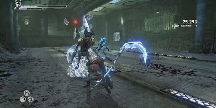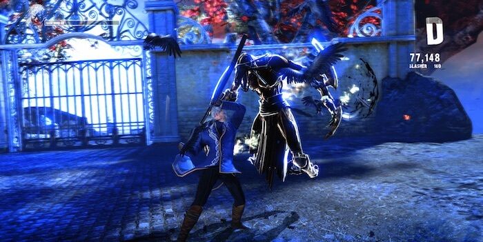 Al igual que Dante, Vergil tiene una faceta de demonio y otra de ángel que se desbloquean cada vez que el jugador pulsa uno de los gatillos. Estos movimientos de demonio y ángel complementan los ataques básicos de espada y alcance de Vergil, lo que le proporciona un conjunto de tres niveles para elegir. Lo que diferencia a Vergil es que sus ataques son un poco más deliberados (es decir, más lentos) que los de Dante. Mientras que en Devil May Cry todo gira en torno a los golpes rápidos y los combos llamativos, Vergil debe ser más preciso con sus movimientos, al mismo tiempo que aspira a conseguir la máxima puntuación en combos. Jugar como Vergil es, obviamente, una experiencia diferente, pero no por ello menos divertida. Es una pena que los componentes del DLC no sean también nuevos.