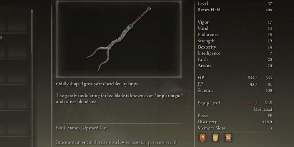 A pesar de no tener un aspecto tan épico como las otras entradas, la Espada Grande Bifurcada es un arma de fuerza decente que puede aplastar a los enemigos en un par de empujones una vez que se ha mejorado lo suficiente. Además, Sello (Corte ascendente) es una habilidad útil para manejar la postura y el posicionamiento, ya que puede absorber un golpe (Sello) y luego seguir con un Corte ascendente que puede derribar a la mayoría de los enemigos, excepto a los grandes.