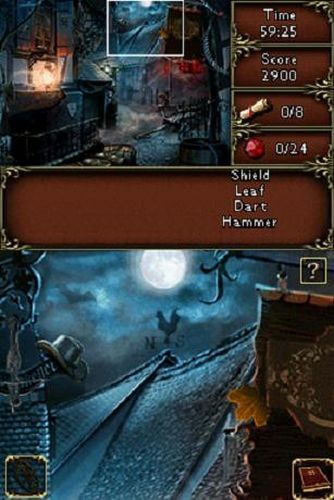 Hay un número muy reducido de puzles que podrían parecerse vagamente a algunos de los retos más fáciles de un Profesor Layton juego, pero son tan escasos y distantes entre sí que los jugadores los olvidarán poco después de completarlos. La jugabilidad de Vampire Moon se divide en una serie de minijuegos de escondite. Sí, los fondos y los objetos cambian, pero la mecánica es la misma durante toda la experiencia. Tampoco hay ninguna lógica detrás de los objetos, ya que la mayoría de ellos -por ejemplo, un gato, una estrella o una pieza de ajedrez- no tienen ninguna relación con la historia. Cada objeto se selecciona simplemente por su capacidad para integrarse en el fondo, y algunos lo hacen muy bien. Para los jugadores que se queden atascados, hay un botón de pistas que actúa más bien como un botón «it’s over here», señalando exactamente dónde está escondido el objeto.