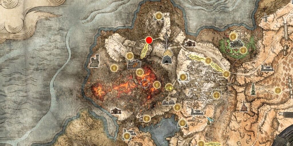 El lugar ideal para empezar a buscar el escudo de bobina es el Noveno Campamento del Monte Gelmir (marcado en rojo en el mapa de arriba), con el que los jugadores que exploren la región del Monte Gelmir (probablemente buscando continuar las líneas de búsqueda de Patches y/o Rya) probablemente ya se habrán topado.
