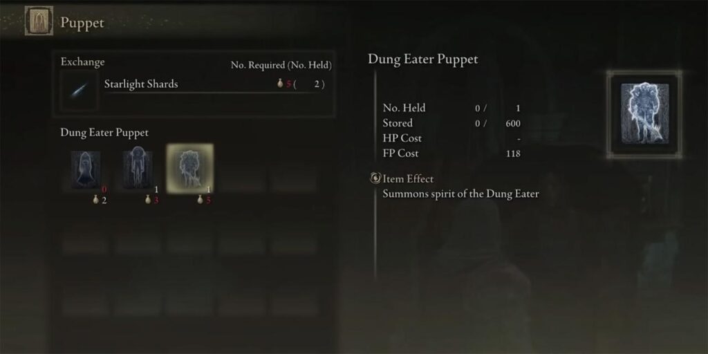 Siéntate primero en una Gracia, luego vuelve a Seluvis y pregúntale por esta sala. Debería ofrecer todas sus marionetas, como la marioneta Jarwight y la marioneta Therolina de la doncella de los dedos, así como la marioneta Dung Eater. Si el Devorador de Estiércol no aparece aquí, los jugadores pueden comprar algunos de sus hechizos, así como darle una Estrella de Ámbar y debería aparecer la opción de pedir otra Marioneta. El Devorador de Estiércol estará en esta tienda si no ha aparecido antes.