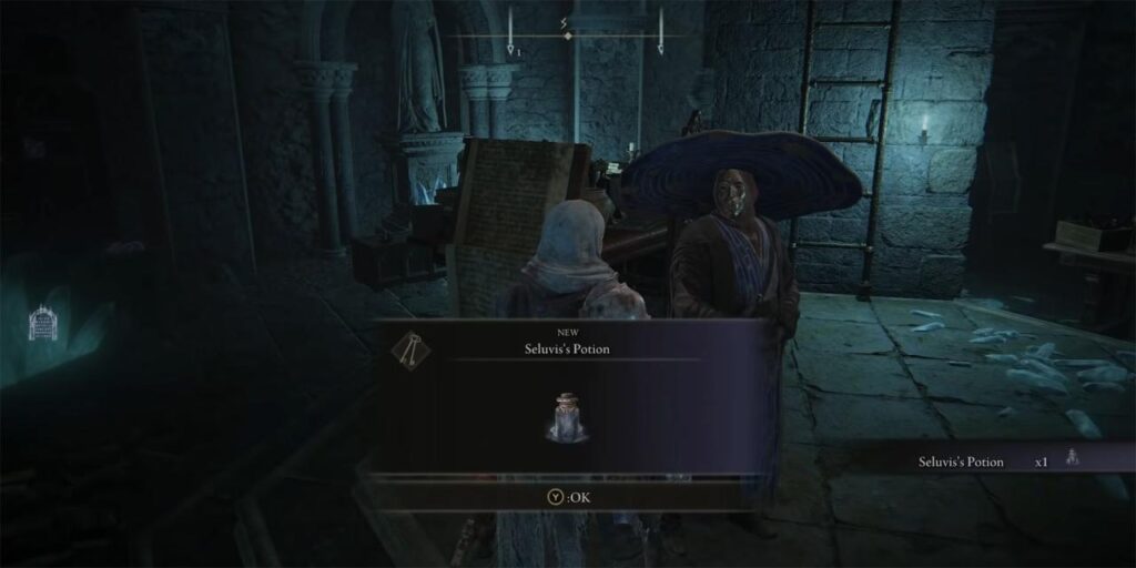 Al hacer esto, Seluvis le entrega al Tarnished una poción de su autoría (llamada Seluvis’ Potion) y le dice al jugador que le dé este brebaje a Nepheli Loux, la hija adoptiva de Sir Gideon Ofnir’. Esta es la poción que los jugadores necesitan para convertir a Dung Eater en una Invocación Espiritual, así que no se la entregues a nadie más (Nepheli o Gideon) hasta que llegue el momento.