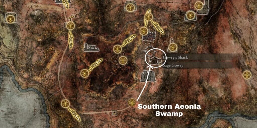 Tras la muerte de Millicent’, vuelve a la Choza de Gowry’ en Caelid y habla con Gowry. Vuelve a cargar la zona para encontrar al hombre muerto y recoge el Talismán de lienzo de Flock’s y el Porta campana de Gowry’s de su cuerpo.