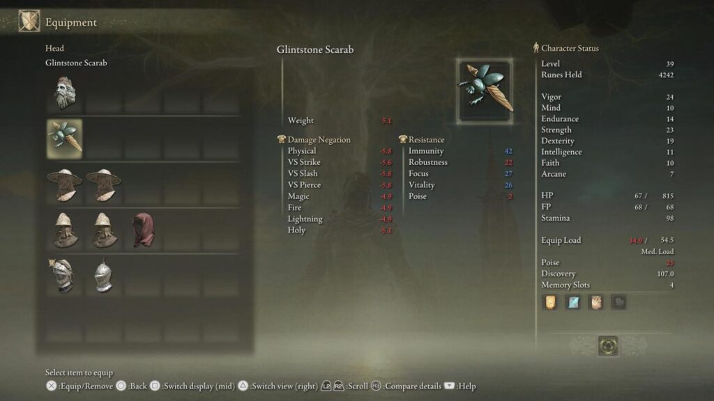 El Escarabajo de Piedra Brillante puede no parecer un Yelmo a primera vista, pero, sí, los jugadores del Anillo de los Eldenses pueden llevar este escarabajo en la cabeza.Y aunque esta pieza de equipo aumentará el daño recibido, llevarla reduce ligeramente el coste de PF al lanzar hechizos.