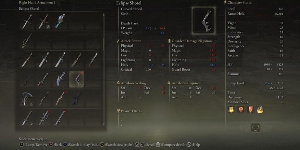 El Shotel Eclipse tiene la Ceniza de Guerra de la Llamarada de la Muerte, que inflige acumulación de Tizón de la Muerte y tiene un segundo ataque de golpe de seguimiento. Los jugadores deben tener 10 de Fuerza, 25 de Destreza y 30 de Fe para manejar el Shotel Eclipse – cuando está completamente mejorado, tiene escala D en Fuerza y escala C en Destreza e Inteligencia.