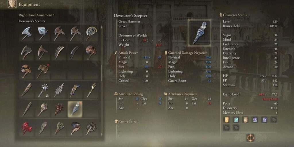 El Cetro del Devorador’ viene con la Ceniza de Guerra Devoradora de Mundos, que puede usarse para restar puntos de vida a los enemigos tras golpearla contra el suelo. Requiere 24 de Fuerza, 20 de Destreza y 25 de Fe para ser usado, y tiene una escala C en las tres estadísticas cuando está completamente mejorado.