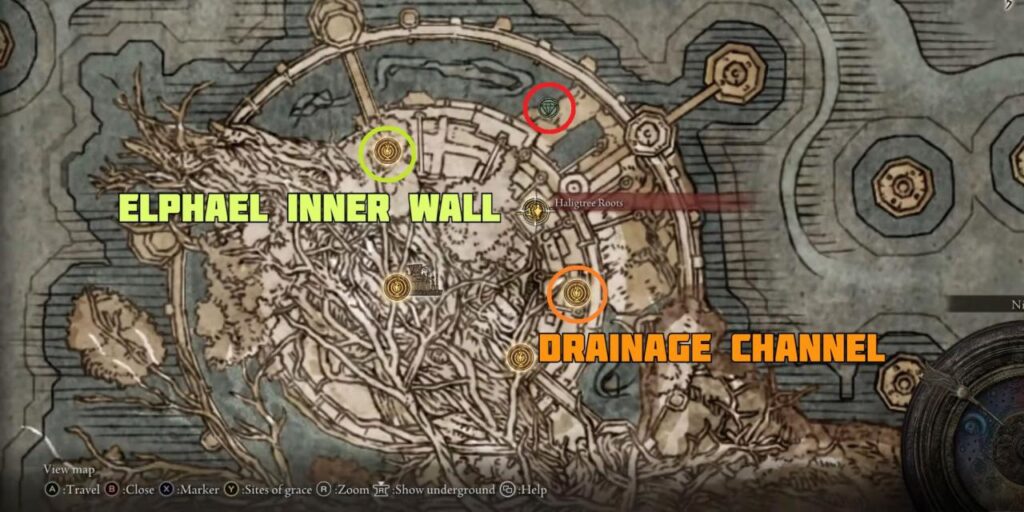 Después de explorar a fondo la ciudad plagada de raíces, los jugadores se encontrarán con el Sitio de Gracia «Muro interior de Elphael». Desde aquí, dirígete a través del arco flanqueado por braseros, hacia abajo y a la derecha, por un pasillo curvo consumido por las raíces.