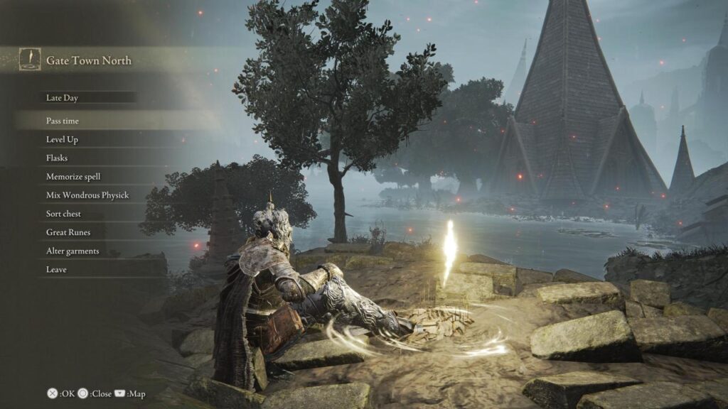 Para hacer que el pájaro del rito de la muerte aparezca, ve al sitio de la gracia perdida cercano, y luego elige la opción que dice «pass time.» Cámbiala a nocturna, y luego revisa el área al sur del punto de guardado para ver si el pájaro aparece. Si no aparece después de caminar durante un minuto, cambia la hora del día de nuevo, y luego viaja rápidamente al Sitio de Gracia Perdida de la Ciudad de la Puerta Norte.