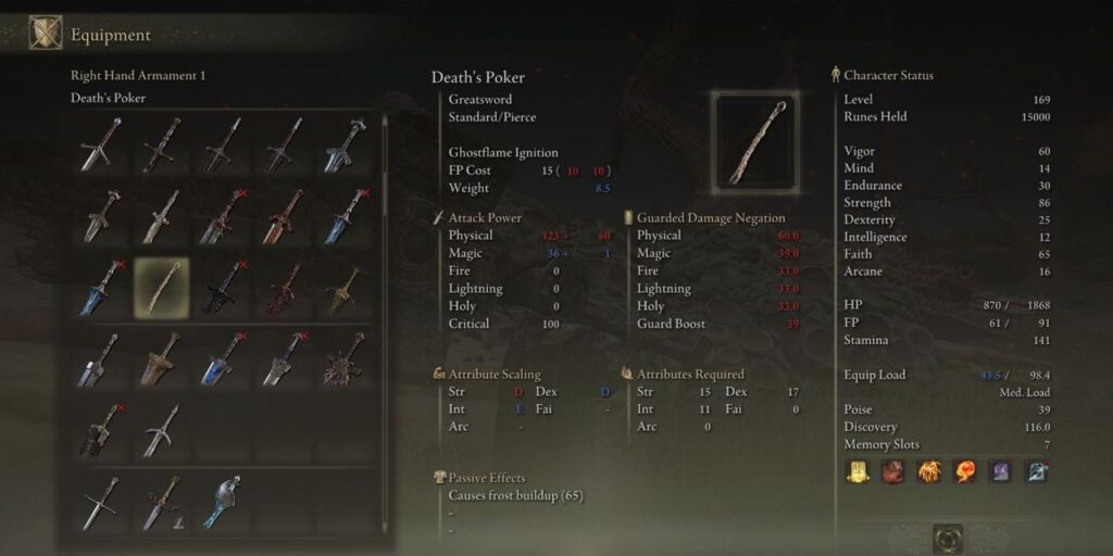 El Póker de la Muerte es una gran espada que requiere 17 DEX, 15 STR y 11 INT para ser manejada correctamente. Aunque su escala es más o menos (C) con la Fuerza, su mejor escala es la Destreza, con una eventual calificación B cuando se sube a nivel +10. Mantiene una acumulación de Escarcha constante de 65 desde el nivel 1 y puede infligir un gran daño a aquellos que conozcan los patrones de ataque del gran espadón. También es capaz de infligir daño de llama fantasma gracias a su habilidad única, Ignición de llama fantasma. Al usarla, el jugador apuntará la espada hacia el exterior, lo que provocará una pequeña explosión de Llama Fantasma AOE desde la punta de la espada.