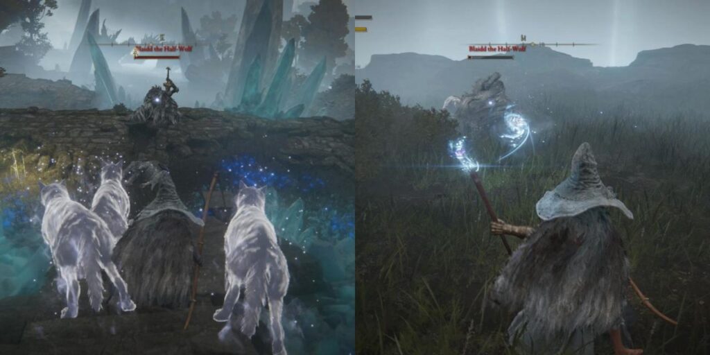 El Medio Lobo tiene una variedad de ataques y la mayoría de ellos infligen mucho daño. Tiene un gran alcance al atacar, así que lo mejor es asestar un golpe y alejarse inmediatamente. Afortunadamente, en este combate se pueden invocar Espíritus. Las cenizas de lobo solitario son una gran opción para distraer a Blaidd mientras Tarnished ataca.