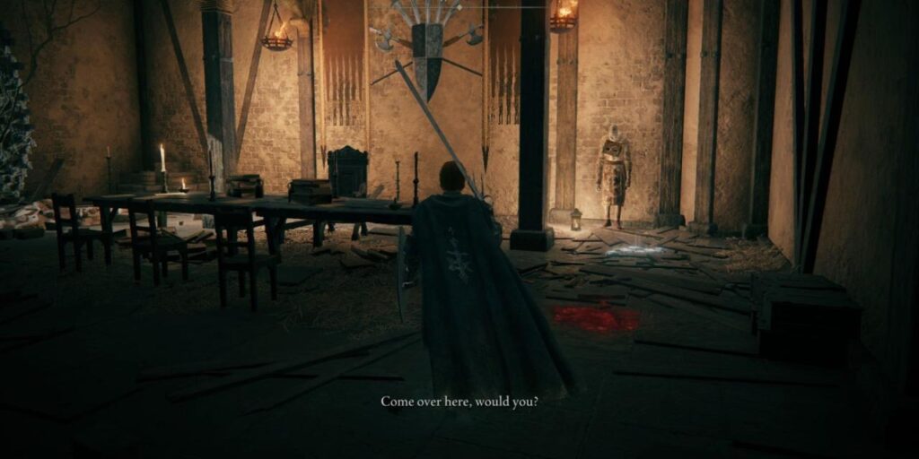 Al entrar en esta sala, las luces se apagan y la puerta se cierra de golpe tras de ti. Después de uno o dos segundos serás emboscado por un Banished Knight, un usuario de escudo bastante fuerte. Mátalo y busca un cofre en el fondo de la sala oscura, que contiene el Talismán de la Espada Curva.
