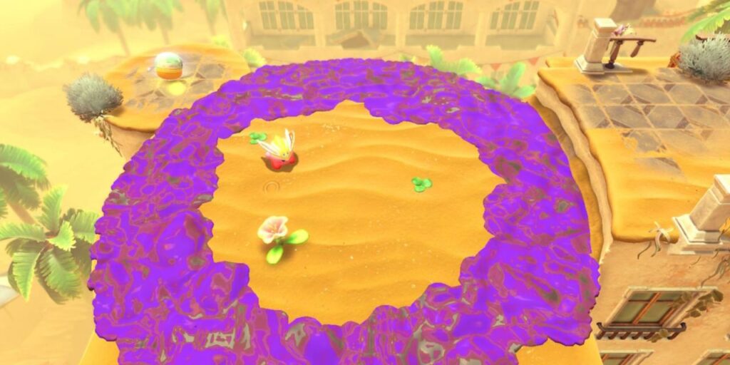 Cuando los aficionados se adentren en la siguiente zona de este nivel de Kirby y la Tierra Olvidada, se encontrarán con una plataforma circular a la izquierda más allá de un anillo de estiércol venenoso. Mientras se cuidan de los enemigos de la zona, un rápido uso de la habilidad de flotación de Kirby’ permitirá a los fans recogerla.