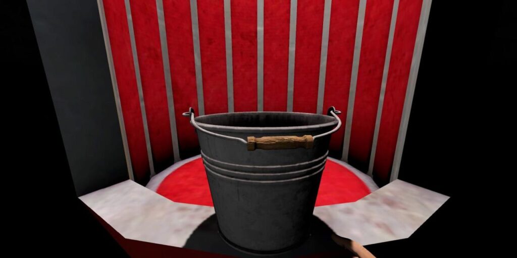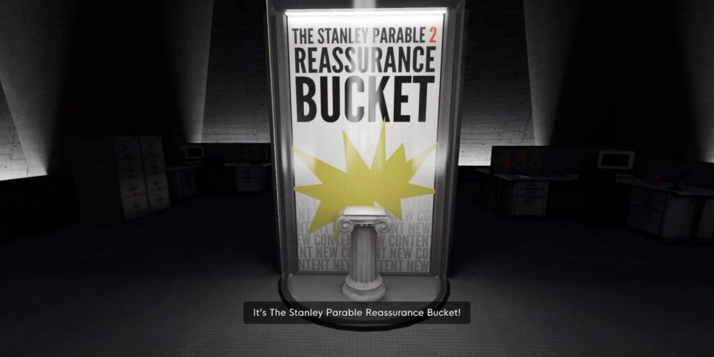 Todo esto es un camino necesario, porque entre la disposición de la expo con varias características cómicas del juego hay un objeto llamado The Stanley Parable Reassurance Bucket. Si recoges este objeto y juegas hasta el final de la ruta «Nuevo contenido», el jugador podrá recoger este cubo en futuras partidas.