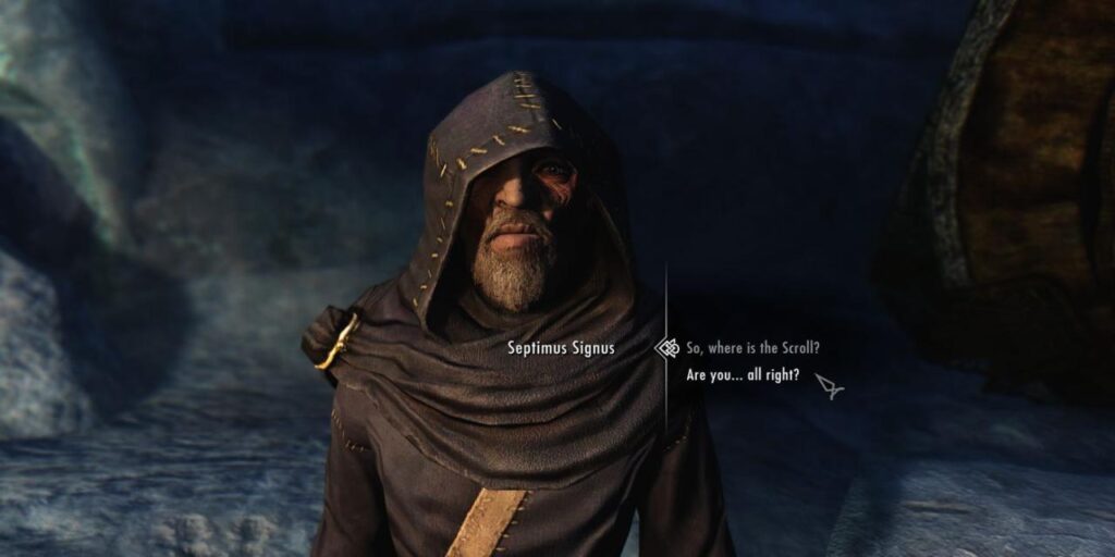 Discerning the Transmundane comienza cuando el jugador habla con Septimus Signus, un mago que vive en un puesto de avanzada en los lejanos campos de hielo del norte de Skyrim’. Para llegar a este puesto de avanzada, dirígete directamente al norte desde el Colegio de Winterhold durante unos minutos – después de pasar por el Templo de Sky Haven, un icono debería aparecer débilmente en la brújula del juego para guiarte.
